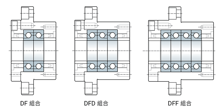 DFF 型式的組合則是兩方向皆使用兩顆軸承來加強雙向的軸向負載能力。
